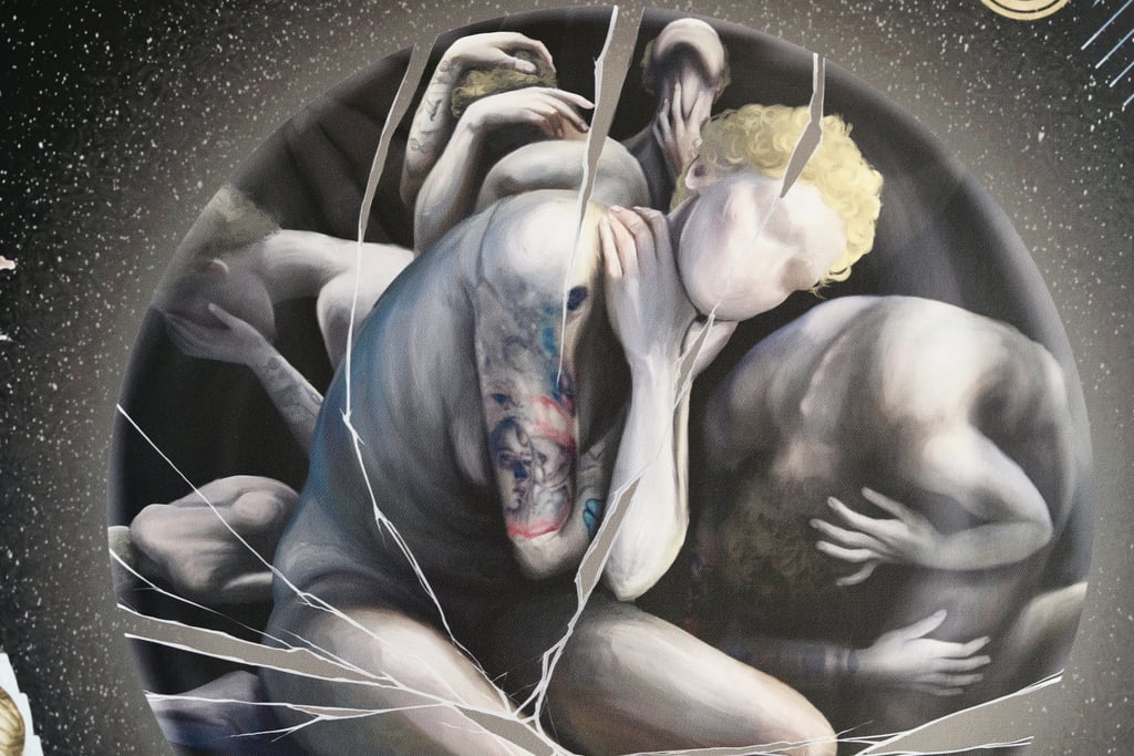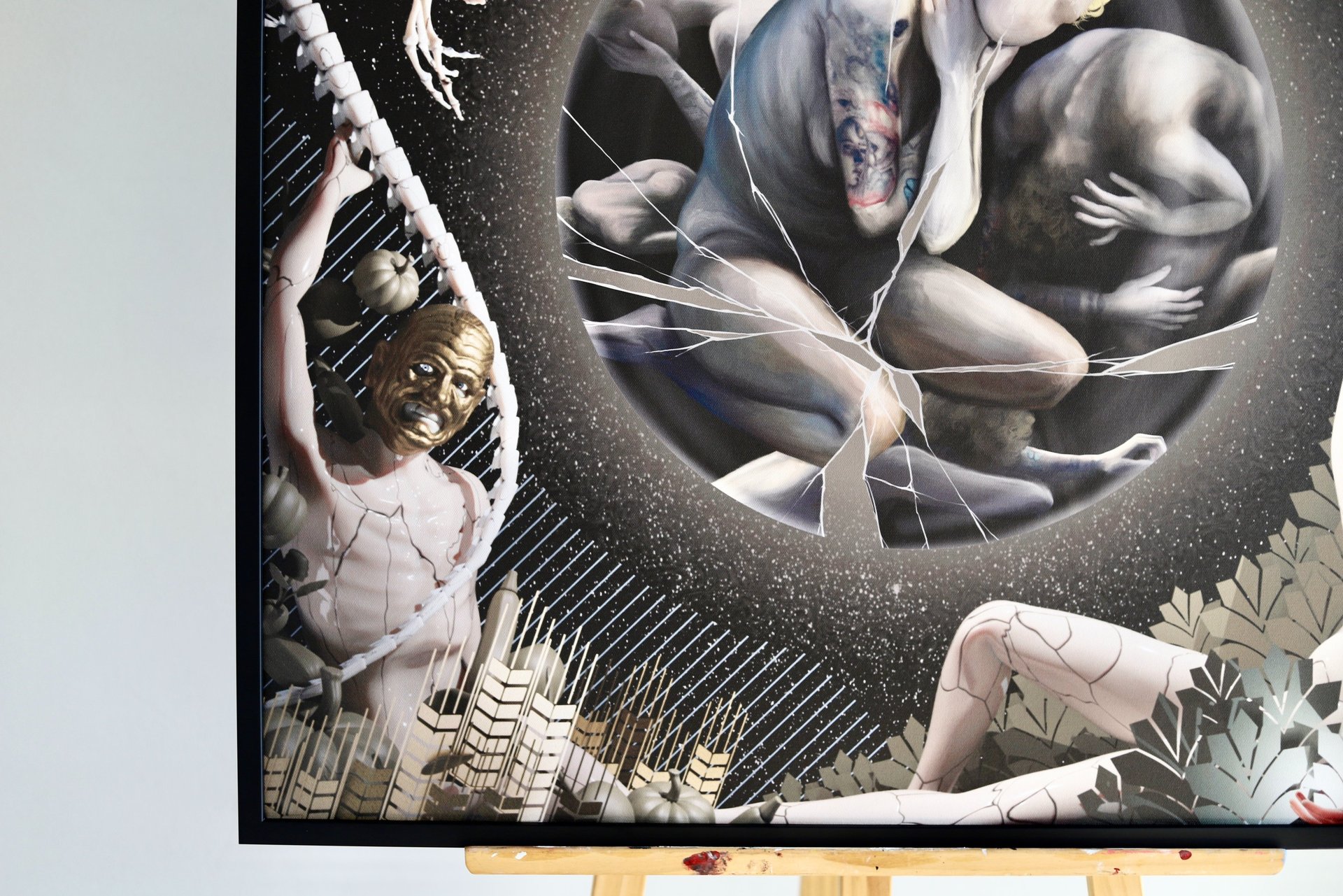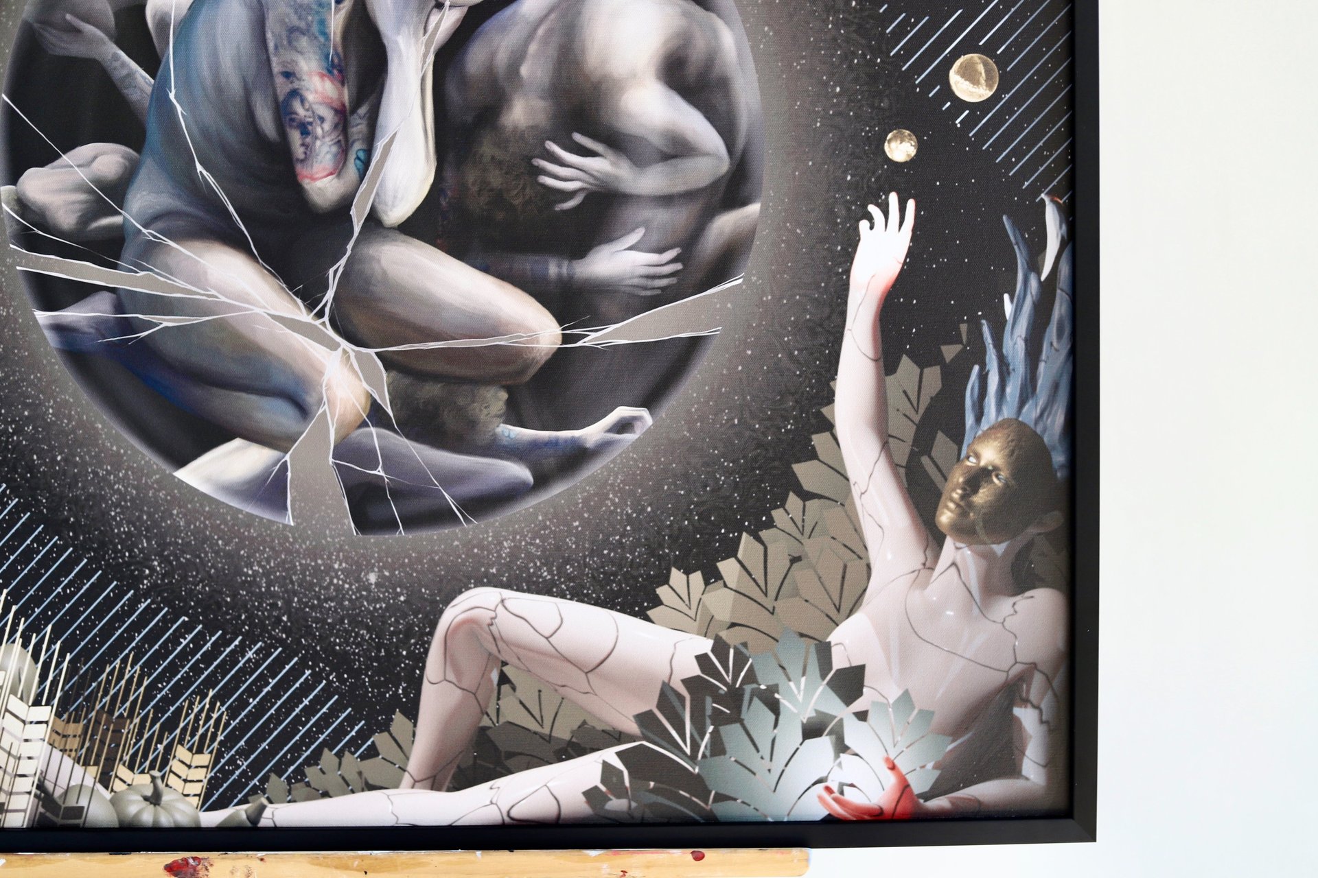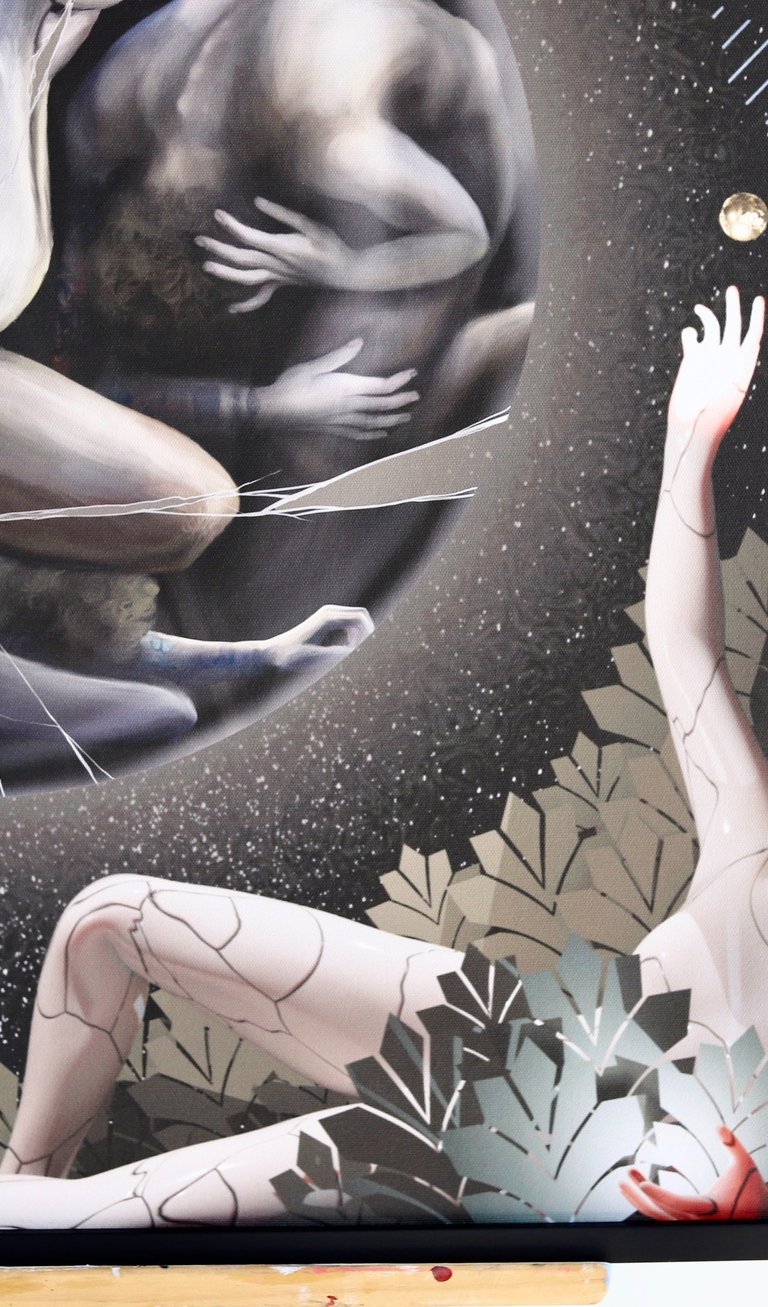 Su Šarūnu pasirinkome bendrą temą – įkvėpimą. Tuomet sutarėme dėl 80 × 80 cm formato ir pasidalijome drobės erdves: mano dalis buvo apskritimas centre, o Šarūno – visos šoninės kraštinės.