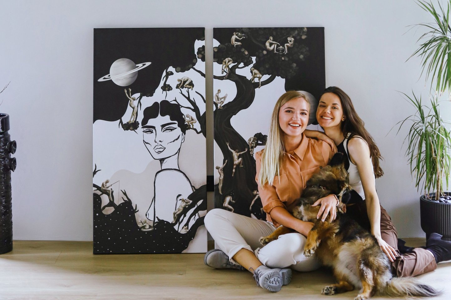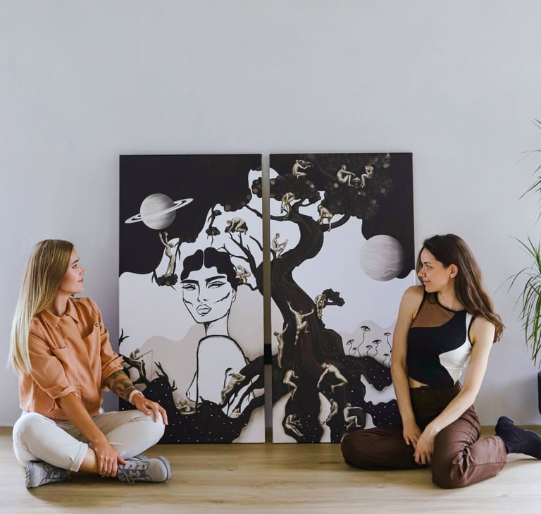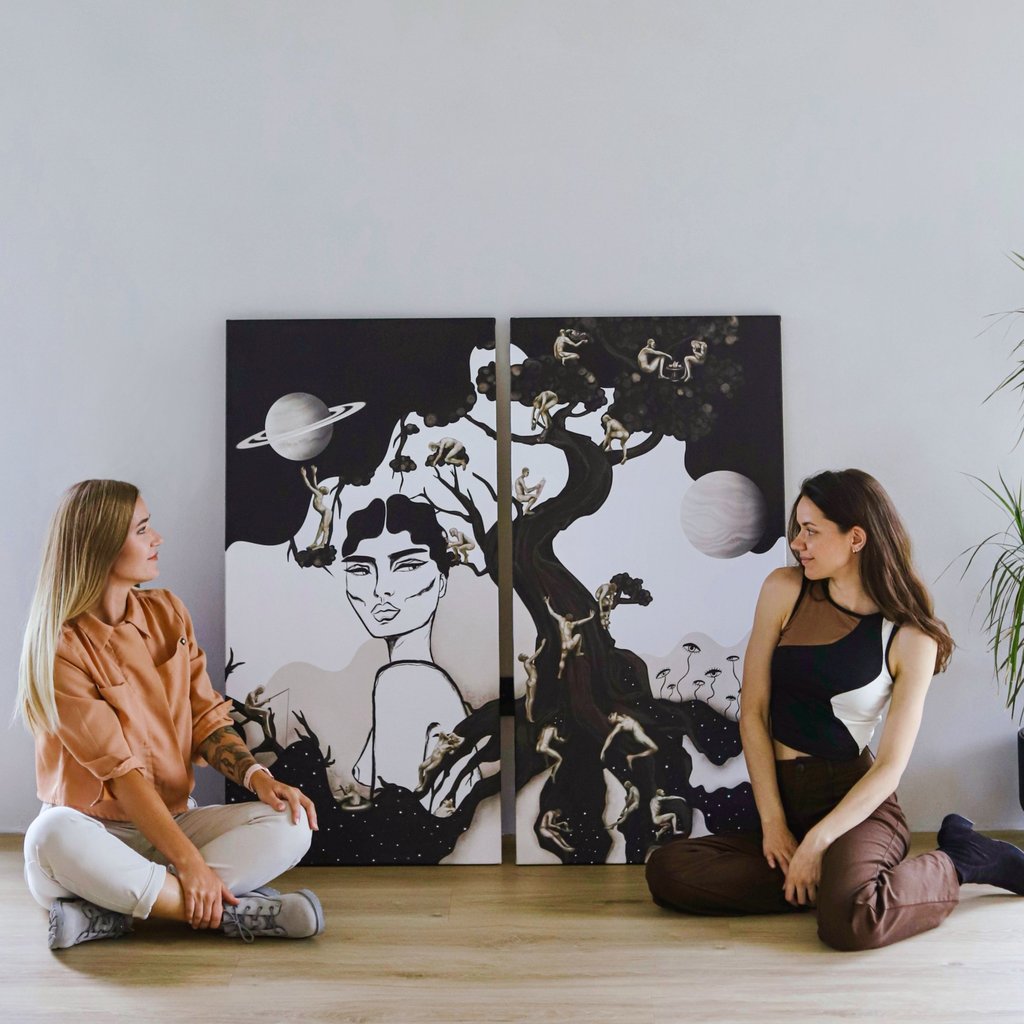 Abi turėjome po atskirą 120x60 cm drobę nuo kurios pradėjome, nežinodama, ką kuria kita. Kai abi atlikome po savo dalį ir palikome vienai kitai užpildyti tuščias vietas - apsikeitėme darbais ir sudėjome galutinius potėpius viena kitos drobėse.