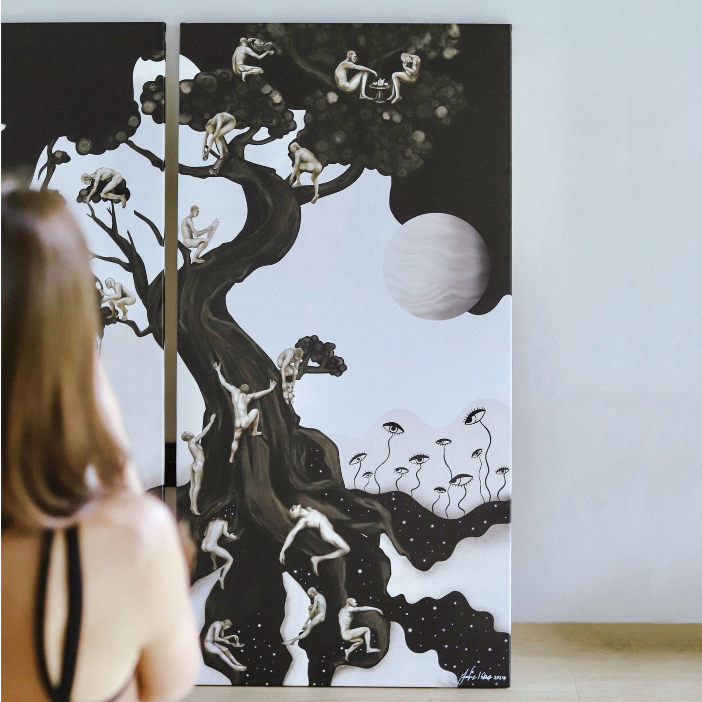 Kai sudėjome abu paveikslus Silvija pasakė, kad ji paveiksle mato du atskirus pasaulius, tokius skirtingus, bet nepaisant jų skirtumų, jie gali gyventi vienoje erdvėje. Taip ir gimė paveikslo pavadinimas - „Du pasauliai”, gimę iš kūrybos kelio