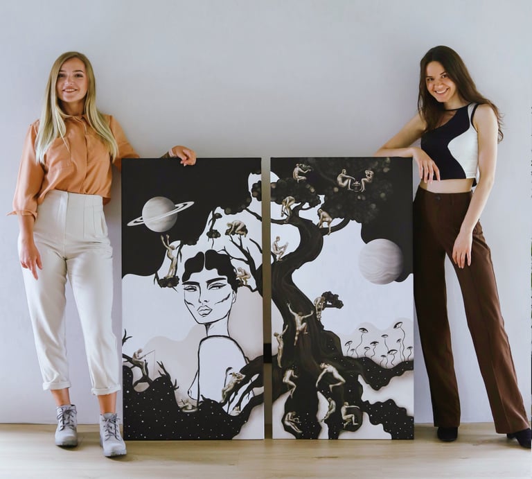 Skaitmeninio darbo spauda ant drobės. Paveikslo autorės Silvija Babelytė ir Julija Gumbrytė. Paveikslo dydžiai 120x60 cm. Kartu - 120x120 cm.